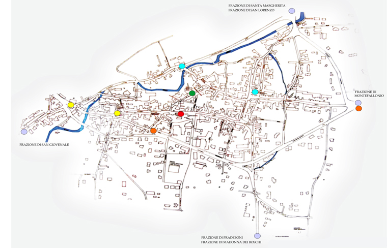 Zona A - Municipio; Zona B - Ricetto; Zona C - Damount; Zona D - Daval; Zona E - Confine del concentrico; Zona F - Frazioni